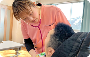 医師の指示に基づく医療行為(内服管理・吸引・インスリン注射・排便コントロール・カテーテル管理など)や健康管理を行います。